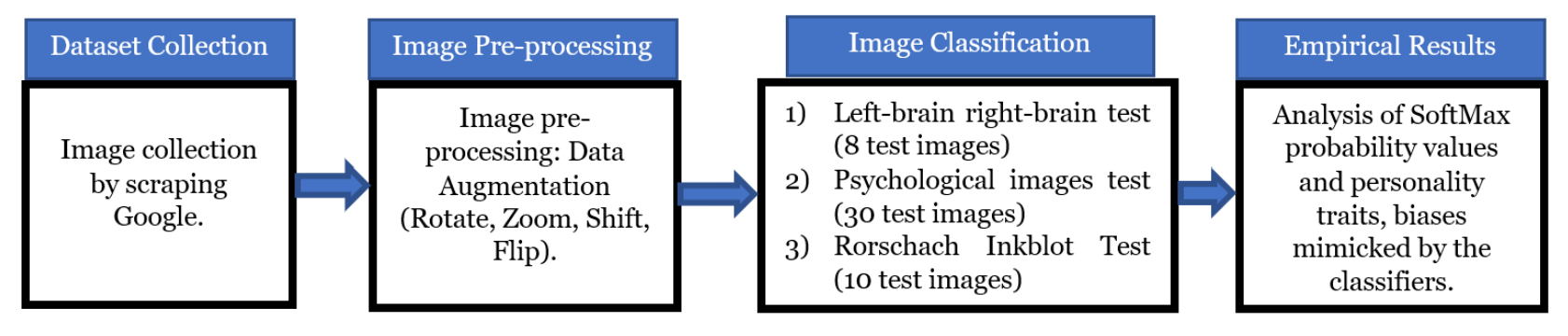 Two key aspects of artificial intelligence are its ability to make decisions and attempt to mimic humans. Decision-making in humans is, however, not straightforward and depends significantly on the person’s mental state, personal biases, and personality. In this study, we attempt to empirically understand if deep learning image classifiers also exhibit such inherent biases or if they act neutrally in any given situation. To this end, we perform three experiments – left-brain right-brain test, psychological images test, and Rorschach’s inkblot test on eight different state-of-the-art deep learning classifiers. A detailed analysis of the SoftMax probability scores is done rather than an analysis on measures like accuracy and F1. The experimental results suggested that most models work similar to a left-brained person, do not always predict the same class when given images consisting of multiple object classes, and usually detect larger objects rather than smaller ones. We believe that understanding these inherent biases would help future researchers take necessary actions while building image classification models. (GitHub, Paper)