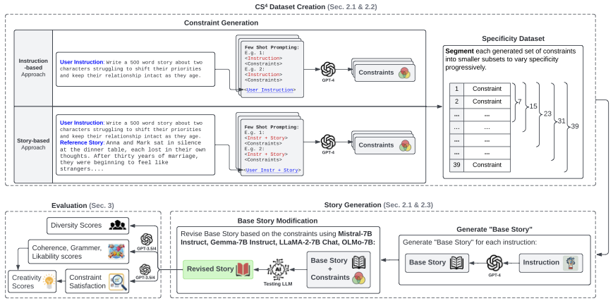 Additionally, our experiments on OLMo suggest that while reinforcement learning with human feedback (RLHF) enhances LLMs' ability to output superior narratives under limited constraints, its effectiveness diminishes severely in the presence of more constraints. The results suggest that RLHF can help LLMs select better stories from their training data but has limited influence in boosting LLMs' ability to produce creative stories that are unseen in the training corpora. (GitHub, Paper)